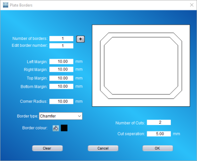 | The third border is a single (Number of cuts: 1) ellipse (Border type) with a 2 mm left and right margin) and a 10 mm top and bottom margin.